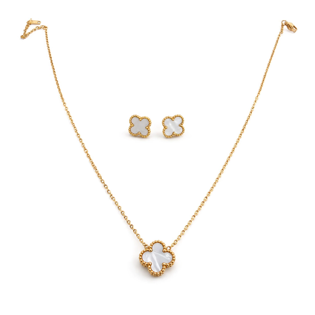 Kit colar e Brinco Trevo Branco Dourado Aço Inoxidável
