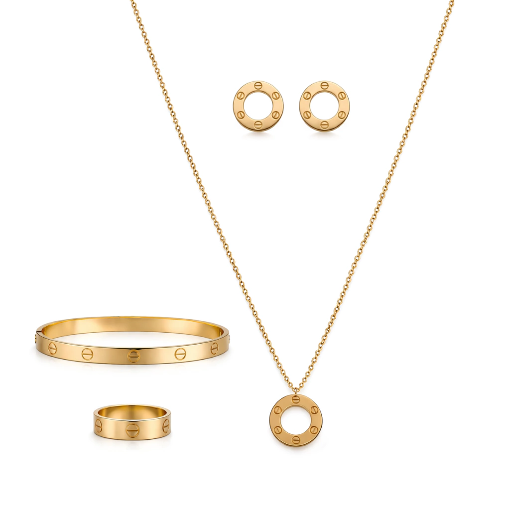Kit Inspiração Colar Brinco Bracelete e Anel Dourado Aço Inoxidável
